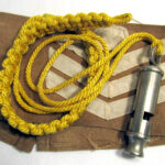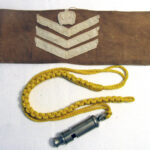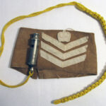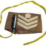 This whistle comes with an original Staff Sergeant Brassard (A band or badge worn around the upper arm), the Brassard has the Staff Sergeant "CROWN & STRIPES" Insignia "Three chevrons beneath a crown" have been handsewn onto a khaki tan cotton armband with press studs. Staff Sergeant is a non-commissioned officer rank with specific duties such as supply within the sub-unit.