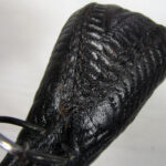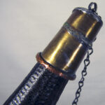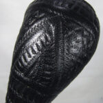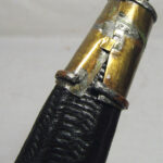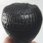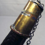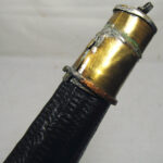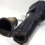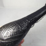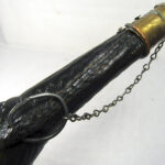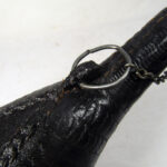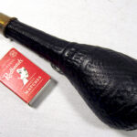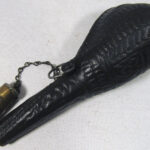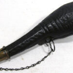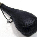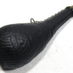 For your consideration, you are viewing an Antique 20th-century, from the Middle Eastern Ottoman Empire, this is an Empty Bedouin Camel Scrotum Gunpowder Black Powder Flask, completely hand-made, from the dried leather skin of a Camel's Scrotum, handstitched, hand-carved with decorative geometric designs to the outer skin, with a brass cap/lid and a steel chain attached to the cap and the body. These were commonly used by the wealthier Bedouin Nomads or Arabic People of the Middle East, to store black powder for use with their musket flintlock guns. This powder flask was once a trusty companion to a flintlock-wielding Bedouin Nomad Soldier of the Camel cavalry and is a unique antique collectable accessory from an age cloaked in gunpowder. Make a great conversation piece to add to your collection or Man Cave. CONDITION: This powder flask is Antique from the early 1900s era, used, and in very good condition for its age and uses in warfare. This is empty and has no powder inside, There is no damage to the leather, the tooled design work is perfect and undamaged, the stitching is all tight and intact, and the metal chain is firmly attached to the body as well as the cap. The cap has a split in it, please see the photos, and it has been made from a combination of Brass, Copper and Metal # Please note: The Photographs form part of the description; Super-sized photos can show the finer details and conditions.- Photos do not show the actual size so please read the description page to get the exact measurements.