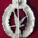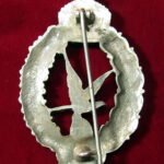 The badge is surrounded by an oval laurel and oak leaf wreath, joined together at the bottom by a bow tie ribbon, topped by the German State Crown, featured in the centre is a finely-detailed eagle in mid-flight, clutching a circular bullseye target in its talons, the reverse is hollow with a barrel hinge and vertical pinback meeting a round wire catch, it has no makers marks.
