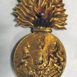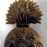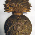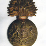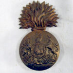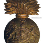 The cap badge of the Royal Scots Fusiliers is a large gilded badge in the shape of a fused grenade. On the ball of the grenade are the Royal Arms surmounted by the Royal Crest with the Imperial King’s crown. On the Royal Arms is the inscription ‘HONI SOIT QUI MAL Y PENSE (the motto of the Order of the Garter) and below the Arms the inscription ‘DIEU ET MON DROIT’.
